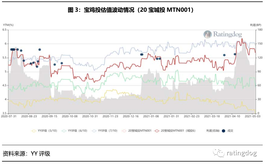 從2020年7月起20寶城投MTN001信用利差走勢運行介于YY評級6至YY評級7之間,近期利差逐漸向YY評級7靠近,說明市場對其認可度也有所走弱