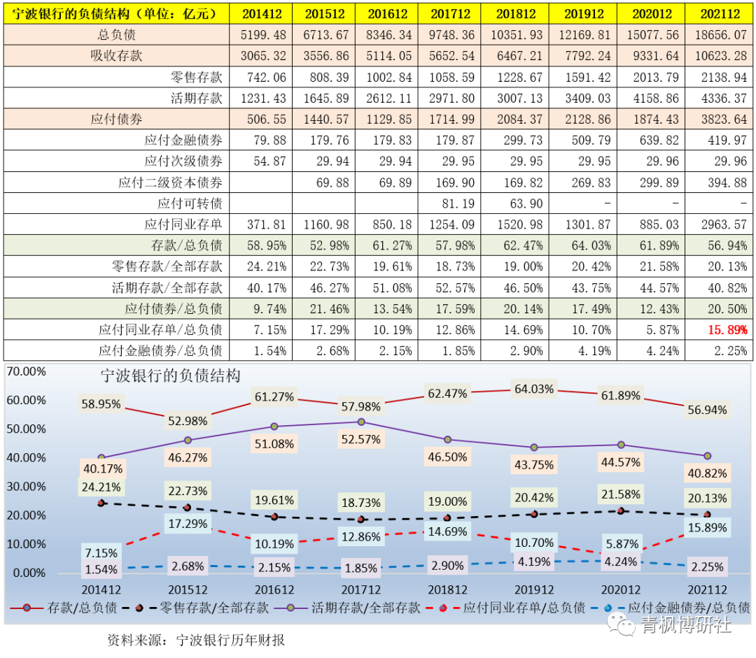 和其它銀行不同的是,寧波銀行的應付債券規模較高,2021年底占其總負債的比例達到20.50%,較2020年底大幅上升8.07個百分點。進一步看,應付債券主要包括金融債、次級債、二級資本債、可轉債和同業存單。截至2021年底,應付同業存單占寧波銀行總負債的比例達到15.89%,貢獻了全部應付債券的78%,可以看出,寧波銀行在負債方面對同業存單的依賴性較高)。