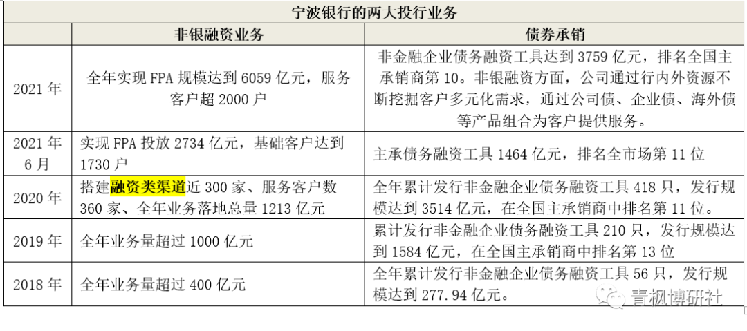2018-2021年的全年非銀融資業務量落地規模分別達到400億元以上、1000億元以上、1213億元和2300億元。考慮到寧波銀行將非銀融資與債券承銷、資產托管同視為中間業務,我們理解這里所謂的非銀融資業務,應該是指結構化融資業務、非標業務和撮合類業務三大類。