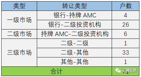 按慣例,我們將行業市場分為三級:銀行出讓債權為一級市場;本地持牌AMC或代持機構在當地出讓債權為二級市場,其余的債權轉讓為三級市場。