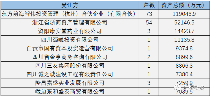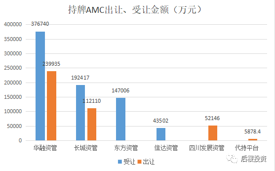 對比上圖數據,華融資管與長城資管均是受讓金額大于出讓金額;未查詢到東方資管、信達資管出讓記錄,未查詢到四川發展資管與代持平臺受讓記錄。